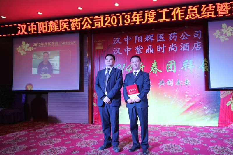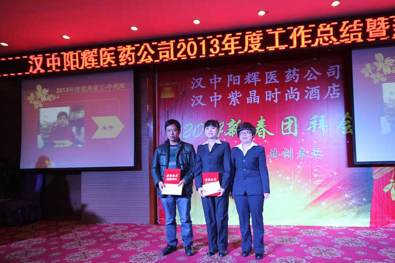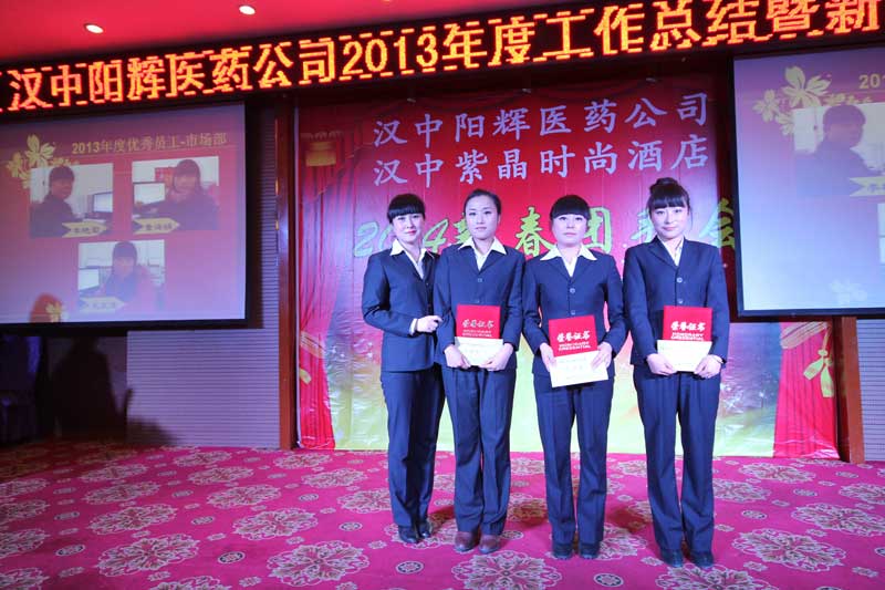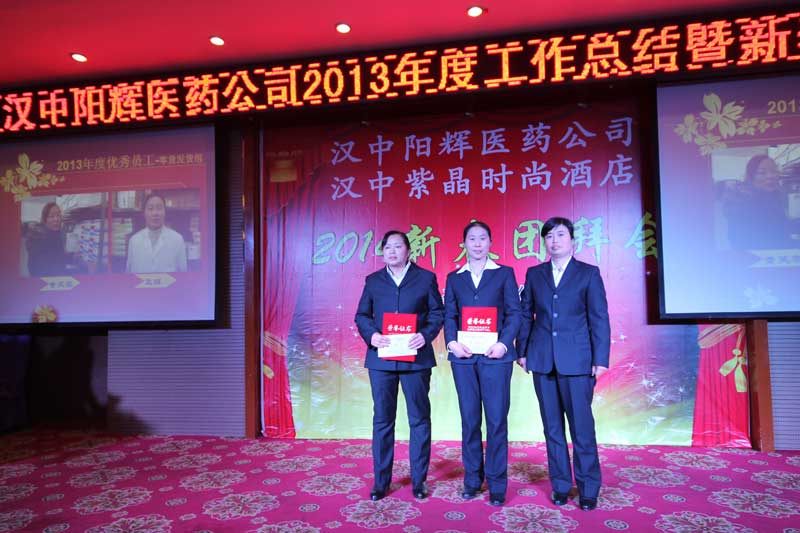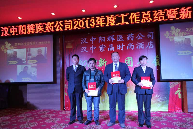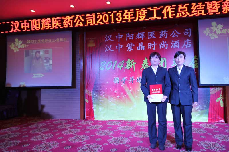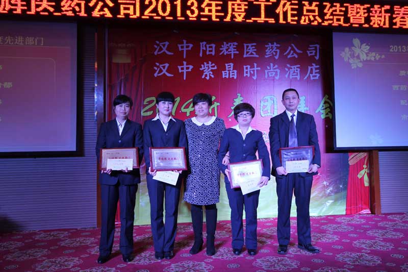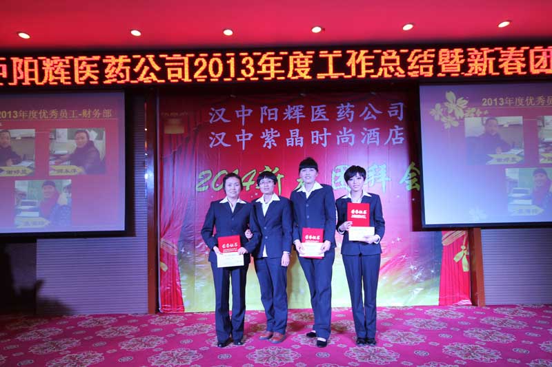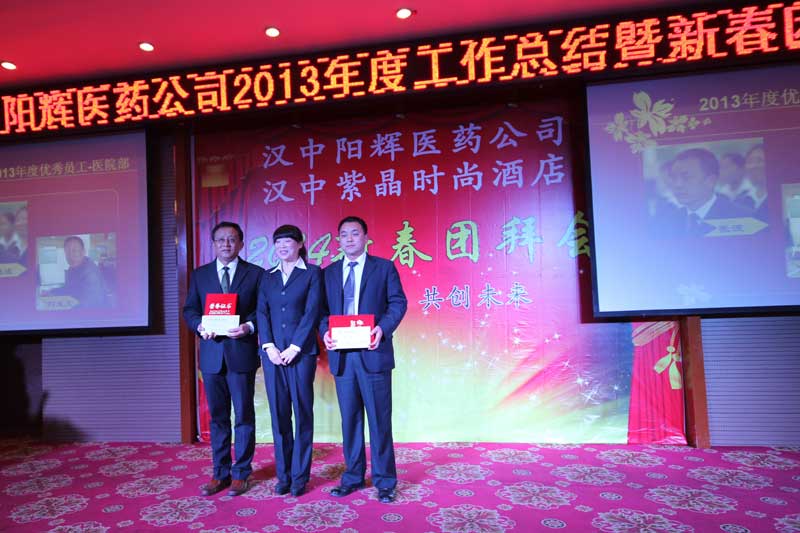 2014年會報道(2/3) 漢中陽輝醫(yī)藥有限責(zé)任公司 >2013年度工作總結(jié)暨2014新春團(tuán)拜會 2014年1月18日下午,漢中陽輝醫(yī)藥有限責(zé)任公司2013年度工作總結(jié)暨2014新春團(tuán)拜會在漢中紫晶時尚酒店舉行。 二、2013年度先進(jìn)部門和優(yōu)秀員工頒獎儀式